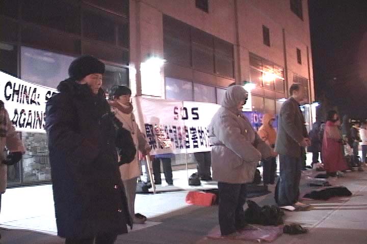 来自十二个国家的36名西人法轮功学员,自发地到天安门广场打坐、举大法横幅,向中国政府请愿,要求还法轮大法以清白。这是海外法轮功学员的大善之举。他们以自己的至诚至善之心告诉中国人民:“法轮大法好!”“真、善、忍是宇宙的最高法则!”他们完全是为了中国人民的利益。但是,他们立即遭到了中国警察的暴力拘捕。为此,纽约地区一百多名法轮功学员从今天下午5点开始,冒着凛冽的寒风,在纽约中国总领事馆前炼功、发正念请愿,对36名西人学员表示声援,强烈要求中国政府立即释放这些被无理拘捕的西人学员。