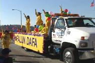 加拿大法轮大法学员在凯陈那,布兰顿,莱磁芒三城市圣诞大游行。美国加州帕莎第那秋季艺术节洪法、讲真相。