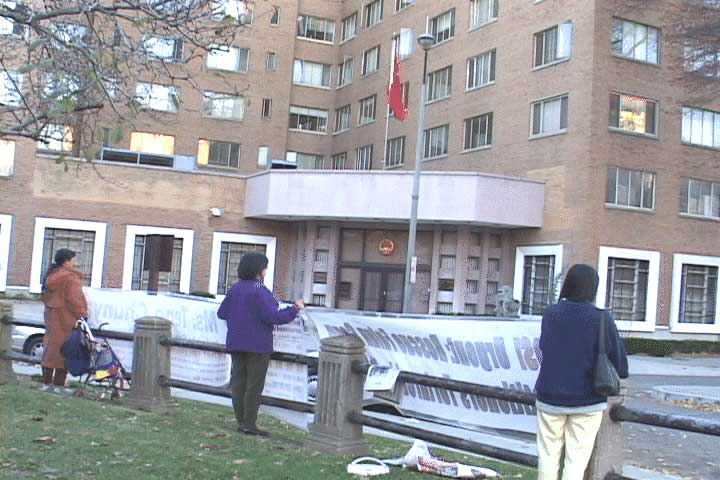 其中一条幅写着“法轮大法永放光辉”;另一条上写着“还李洪志老师清白”。
