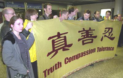 【明慧网2001年11月25日】美联社报导:2001年11月21日星期三,法轮功成员在德国法兰克福市的莱恩主机场展开一面横幅。中国已经迅速驱逐了36名抗议中国政府镇压法轮功精神运动的西方人。图片上的横幅正是他们周二在天安门广场上展开的那面横幅。
