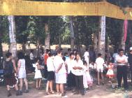 第二天,我们又拿着真相传单来到渡口派发,那天人特别多,能有1千多人。大家都被大法的洪大慈悲所感化,为眼前的庄严场景所震撼。很多人驻足观看,有的低声议论。一个同修一边给大家念大横幅上的内容,一边做一些讲解,有的同修向游人派发真相材料。一个中年人跟同伴说,“今年这一趟可真没白来,法轮功学员给咱上课来了,要不,我还真不知道是咋回事呢。只听广播、电视每天讲个不停。通过这一课,嗯,多少品出点滋味来了,原来广播、电视都是造谣哇!”一中年游客举起相机,拍下了一张张珍贵的照片。