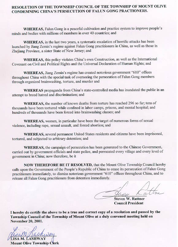 蒙特利物(Mount Olive)市市议会决定:呼吁中华人民共和国政府立即停止对法轮功学员的迫害,撤销遍及全国的臭名昭著的“610”政府办公室,立即释放所有被关押的法轮功学员。