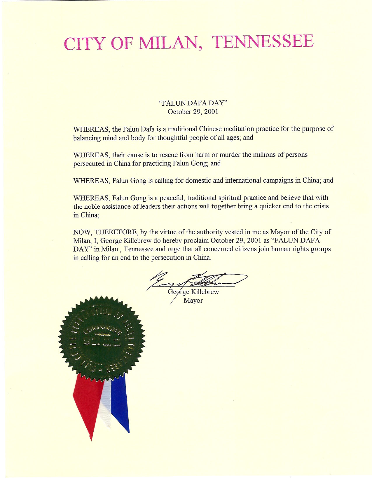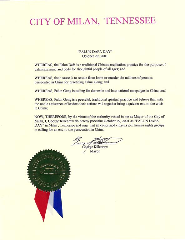 【明慧网2001年11月3日】田纳西州米兰市宣布2001年10月29日为“法轮大法日”。