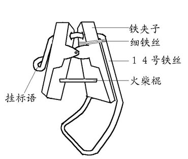 把23厘米的铁丝取16厘米左右,做成如图一所示的三角形状(贴在铁夹子边缘外翻的一边),再把剩下的铁丝穿入铁夹子的两个孔内,穿过后,用钳子把铁丝朝铁夹子口方向弯曲,把铁丝头部弯曲成一个小圆孔,并且和上面的三角形状的间距要宽,便于铁夹子张开口,三角形状的铁丝也朝铁夹子口方向微微弯曲,大约30角度左右,并且超出铁夹子3-4厘米,如图二所示。再把三角形状铁丝和铁夹子一边用细铁丝绑紧。铁丝另外一边小圆孔挂标语。三角形状铁丝穿入尼龙绳,合拢为两股,两股部分长50厘米左右。用细线绑紧。如图一所示的尼龙绳。尼龙绳的另外一头绑上大螺母之类的重物。