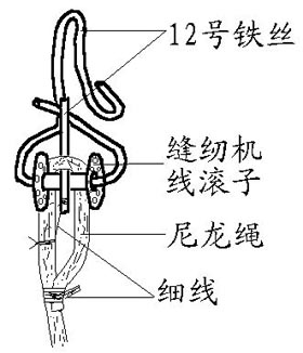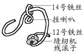 用18厘米左右的12号铁丝和缝纫机线滚子做成如图三、四所示形状。因喇叭比较重,加个缝纫机线滚子好挂一些。