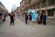 弟子们在车水马龙的中心大街上向周围的人们派发洪法材料和《SOS -紧急救援中国法轮功修炼者》的报章,并同其中许多人进行交谈。在旁边陈列的展示中国对法轮功的邪恶镇压的图片资料展板特别引起人们的注意。