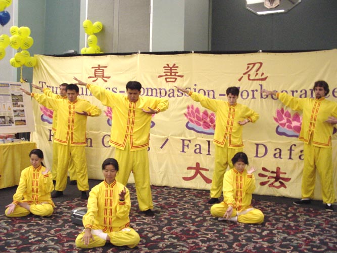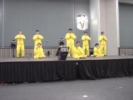 【明慧网2001年11月5日】一年一度的南德克达州立大学(South Dakota State U.)国际晚会(International Nite)是一个以来自不同国家的在校学生为主要参加者的活动。今年的活动于十月二十七日晚举行,大约两百多人参加了这次活动。值得一提的是,法轮大法的功法表演成了这次活动的精彩节目之一。参加功法表演的5名大法弟子中有两名是九岁的小弟子,她们在前排演示第五套功法,吸引了众多台下的观众。另外一名学员在解说中向人们简单介绍了法轮大法和在中国受迫害的情况。
