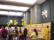 活动结束时我们分别在两个出口处发大法资料。很多人告诉我们他们非常喜欢我们的表演。一位女士高兴地说,两个小孩的表演太真诚和美好了,这使她立刻感到非常放松。当一名弟子与另外一位女士谈到真善忍才会给世界带来真正的和平时,她非常感动,并给了这位弟子一个真诚的拥抱。也有人对我们摆在出口处的蓝底金字的真善忍的牌子产生了兴趣,他们觉得这牌子非常漂亮。还有一位小女孩学会了如何用中文说真善忍。我们离开前,两位小弟子又返回会场,向尚未离开的人们发了大法资料。
