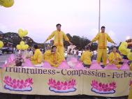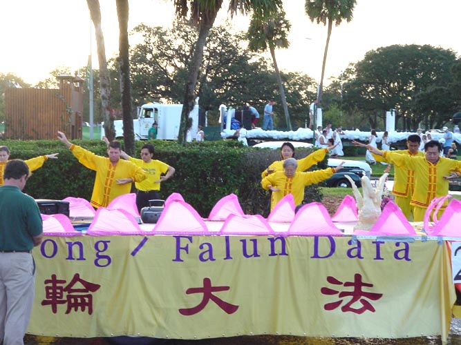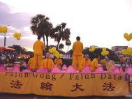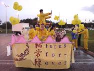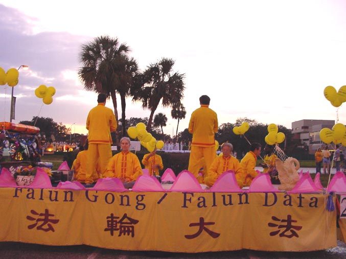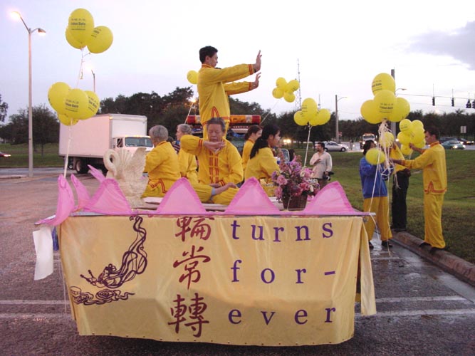 11月2日,在Tampa(坦帕)市的南佛州大学举行了一年一度的校友会彩车游行。几十台各式各样的彩车鱼贯而行。当地的法轮功学员参加了这次游行。游行开始之前,乌云滚滚,大雨降临。学员们全体发正念。不一会儿,雨过天晴。法轮功的彩车异彩飞扬,得到了观众的好评。