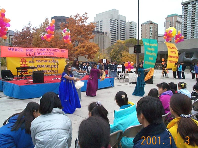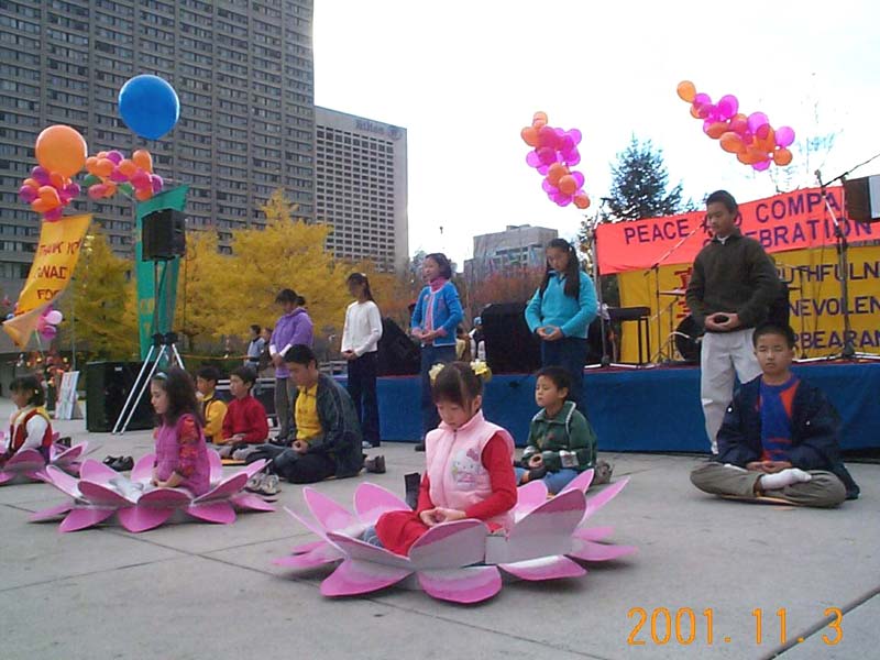 庆典在下午1:30左右进入高潮。徒步分组横跨加拿大四千公里进行“SOS环球徒步步行紧急援救中国大陆法轮功学员”活动的几组法轮功学员走上了主席台。宣读了来自沿途市政府的支持信,宣读了与大法弟子同行一个星期的高中生写来的感人肺腑的来信。当学员代表用他们最亲身的感受表达他们的心声时,在场的人们流下了热泪。而后,议员和各个非政府组织的代表,律师等相继发言,真诚,热情而且旗帜鲜明的表达了他们对邪恶的谴责和对法轮大法支持的鲜明立场。在音乐声中,几十只和平鸽冲向蓝天,欢笑与掌声在广场上响成一片。