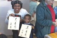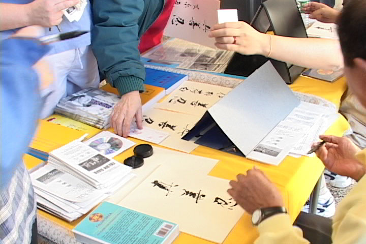 学员写下“真善忍”赠给有缘人。前来索取“真善忍”的人们常常是排起队等候。一对中国人夫妇带着孩子请学员给孩子写“真善美”,学员真诚地对他们说,“其实啊,真善忍三个字是最好的,你想啊,做到了真善忍的人,能不美吗?”“老伯说得对,就真善忍吧!” 另一位中国老人和女儿,女婿,外孙要求把“真善忍”带回家挂在墙上,“想发火时我就看一看这三个字,火就发不出来了。”对于索取“真善忍”的外国人,学员都向他们强调这三个字的涵义,并笑着对捧着“真善忍”三个字的小朋友说,“你可要按照‘真善忍’要求自己哟,对别人要友好,不要对别人发火哟!”小家伙们都若有所思的点点头。