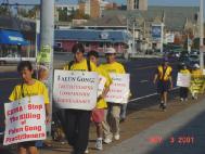 一路上我们向三三两两的行人和路边的商店递送SOS的传单,简短地向他们介绍发生在中国的残酷迫害。有时我们穿过宽宽的马路把传单送给对面驻足观望的人们,有的弟子向路人不停地招着手。