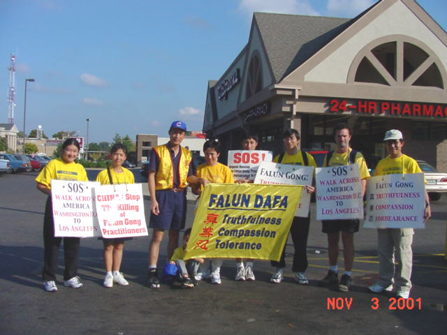 午饭后更多的弟子加入了步行的行列。我们身前身后挂着“从DC走到LA”,“法轮大法”,“真,善,忍”,“紧急救援”的牌子。人们坐在过往的车里向我们鸣笛、招手致意。更有位女士一定要解囊相助,被我们婉言谢绝。