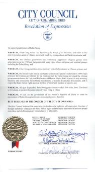 我们支持法轮功学员,并呼吁中国政府立即停止对法轮功学员的镇压。本议会相信言论、思想和宗教自由是人的基本权利,对行使这些基本人权的无辜的人们的迫害是不可容忍的。