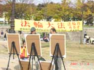 11月24日,百余名大邱学员们老早来到会场,会场门口摆放了一百多幅大法图片,下午2时,慕名而来的150余人都拿着传单和真相材料走进会场.会场内辅导站购置的投影机向大型银幕播放着大法总会编制的真相录像片与师父教功录像带,然后由三名学员向到会的各界人士讲述得法的经过与大法给自己带来的好处。其中有一人的发言博得了多次热烈的掌声。之后,学员们向到会者教功。