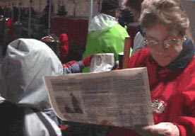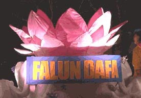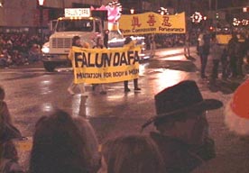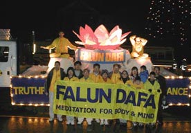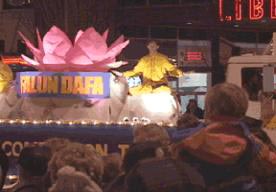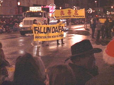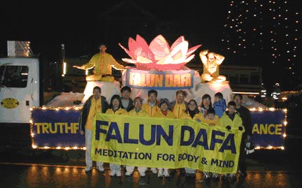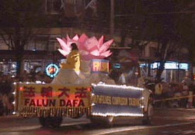 同修在游行队伍中奔跑着发报纸。观看游行的人们欢呼着向我们挥手致意,欢呼声中有“好样的!法轮大法!” “如此美丽的莲花只有天堂才有”。人群中,不乏摇篮里的婴幼儿。当花车经过,摇篮里的小手兴奋的挥动。