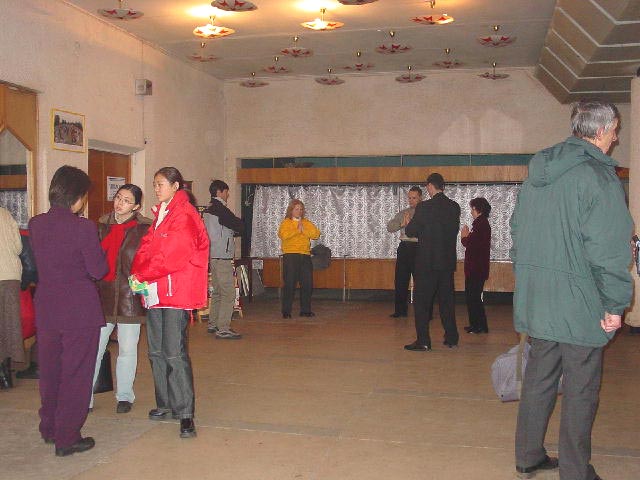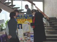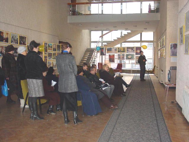 开始我们面临着很多困难,当内心的问题暴露出来,并清除了外来的干扰后,形式就发生了改变。在这三天的时间里,圣彼得堡来的学员对我们帮助很大。图片展在城里最好的展厅之一‘科学家大厦’里举办。在这座大楼里有一个网吧,很多中国大学生经常光顾这里,这是绝好的清除他们头脑里由于邪恶的谎言作祟而形成的对大法不正的观念的机会。一个中国人接连两次进来参观画展,第二天与学员谈了很长时间,然后想学炼功。学员送给他一本中文的《转法轮》