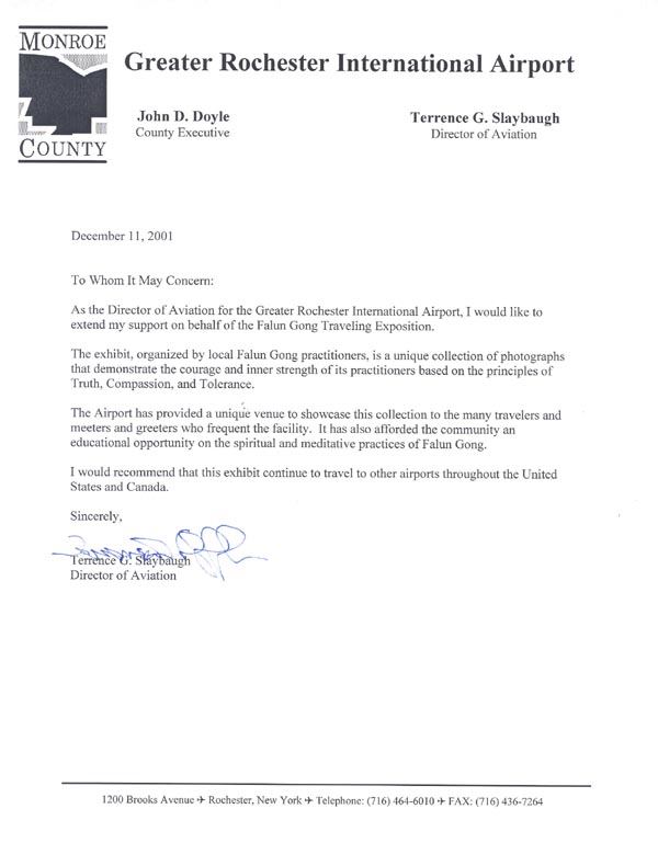 我仅以大罗彻斯特国际机场航空部主任的身份,支持法轮功的图片巡回展。
