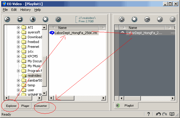 如图,点击左下角Explorer,找到左边相关文件路径,选择相关文件拖拽到最右边的Playlist表中,可以多选,这里只介绍一次转换一个的方法,多选雷同。