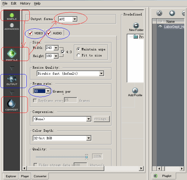 进入Converter窗口后,我们先点最左上边的Simple(简单的),然后点左中间的profile设置新文件的属性。