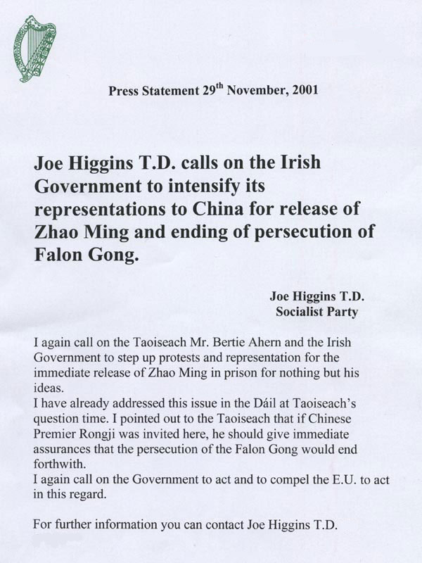 我再次呼吁总理博提.埃亨先生和爱尔兰政府加强呼吁和抗议,要求中国(江泽民)政府立即将为了信仰而被监禁的赵明释放。