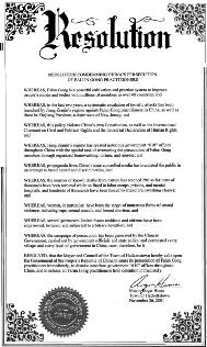 鉴于,法轮功是一个旨在改善人们精神和身体的和平修炼系统,在全世界40多个国家拥有数以百万计修炼者,法轮功的中心原则是真善忍;并且