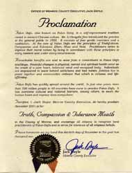 鉴此,我,杰克.多尔,蒙罗郡执行长官,特此宣布2001年12月为蒙罗郡“真、善、忍”月,同时,鼓励全体居民赞同本地区法轮大法学员,及对所有宗教信仰的容忍。