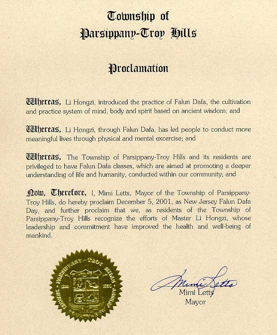 为此,我,咪咪·莱特思 (Mimi Letts),帕瑟伯尼市市长,决定:宣布2001年12月1日为新泽西“法轮大法日”;同时决定,我们,帕瑟伯尼市市民,嘉奖李洪志大师在改善人类健康和福祉方面所体现出的领袖作用和献身精神。