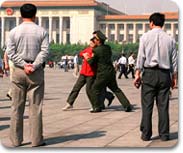 警察总是巡逻在天安门广场周围,随时准备盘问那些想抓拍法轮功学员和平请愿镜头的摄相师和摄影记者。