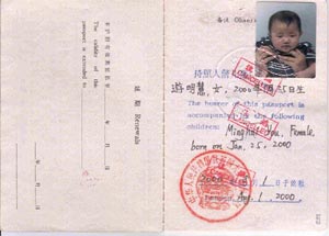 这种局面,也使我们和国内的家人不能团聚。我们的父母都很想亲眼看看小孙女,可是她却不能回到中国。每次通电话,妈妈都在那边问起小明慧的情况,因为她是我的第一个孩子,母亲不放心我,怕我们照顾不好她。我们只好定期把女儿的照片寄回国,让他们安心。