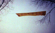 晚上8点,我们四个冒着严寒,在无人走过的雪地上步行20公里,来到久违的家乡,把一幅幅写着“法轮大法是正法”、“真善忍是宇宙大法”等的条幅挂在了四通八达的公路上,为了不让邪魔轻易破坏,一大法弟子还爬上一棵两人合抱粗细的大柳树上把一个4米长的条幅挂在了树尖上。
