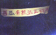 恰逢元宵佳节,2001年2月7日,我和其他3名功友决定到我镇挂大法横幅以窒息邪恶、助师正法。