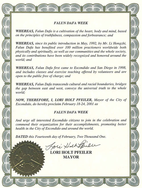 【明慧网2001年2月20日】 加州圣地亚哥郡艾思康地都市宣布2001年2月18-24日为“法轮大法周”。