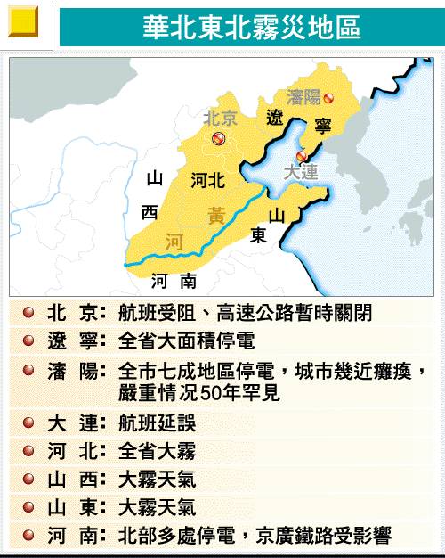 【明报专讯】中国华北、东北地区昨日出现罕见的浓雾,东北地区更因遇上低温天气,使电源导线和电磁瓶结冰短路,辽宁、河南等省出现历来最大面积的停电事故。