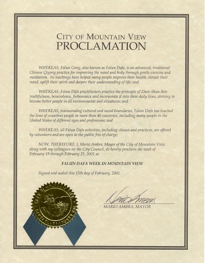 【明慧网2001年2月23日】 加州山景城市宣布2001年2月19日至25日为法轮大法周