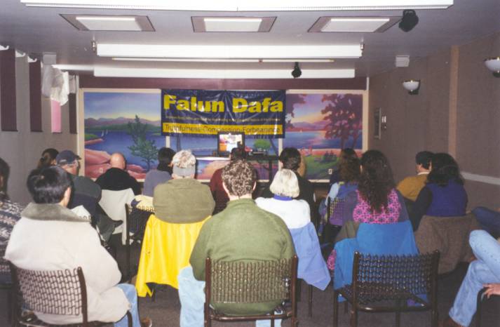近20人参加了下午的介绍会。我们播放了8分钟介绍大法的录像带,以及"法轮大法-真实的故事"录像带。在自由提问及交流中,大家就什么是法轮功,中国政府为什么要镇压法轮功,法轮功怎样有益于身心等进行了较深入的讨论。会场气氛活跃,大家积极发言,不时发出会心的笑声。中间的短暂休息,却成了一对一的更亲切自由的交流。接下来是三位中西方学员的功法表演。台上,三位学员在"法轮大法,真善忍"的大横幅背景下,优美的表演着五套功法;台下,一位西方学员在从容地解释着功法原理,其它人席地而坐,静静地欣赏。伯林顿自由新闻社的记者亚当-斯维曼自始至终都在忙着作笔记,他的摄影记者更是忙得不亦乐乎,全景,中景,近景,特写,什么都不想落下。最后,我们教了两套功法,并讨论了今后怎样继续学功。很多人都希望我们能再次回去,并在伯林顿保持一个稳定的炼功点。大家依依不舍,象久别的亲人,特别是那对为我们发放介绍材料的夫妇更是表示要继续学下去。窗外,已是大雪纷飞;室内,却是意犹未尽。