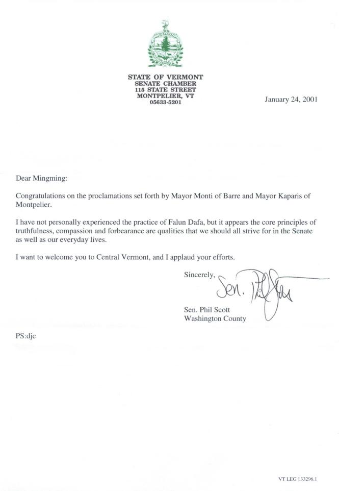 【明慧网2001年2月7日】 维蒙特州参议员菲利普.斯科特(Sen. Phil Scott)就白瑞市(Barre City)和蒙特贝利尔市(Montpelier City)颁发褒奖状致学员的贺信