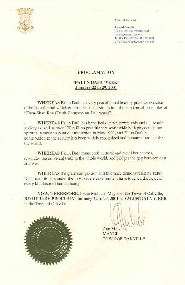 【明慧网2001年2月8日】 加拿大安大略省奥克维尔镇宣布2001年1月22-29日为“法轮大法周”