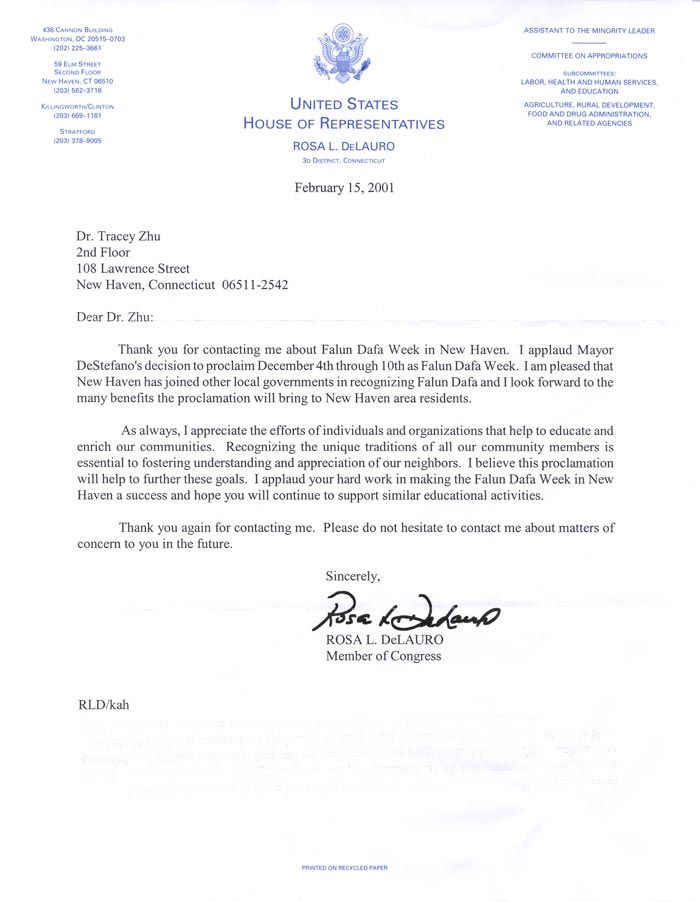 【明慧网2001年3月10日】众议员Rosa L. Delaura 2001年2月15日给康涅狄格州学员的信