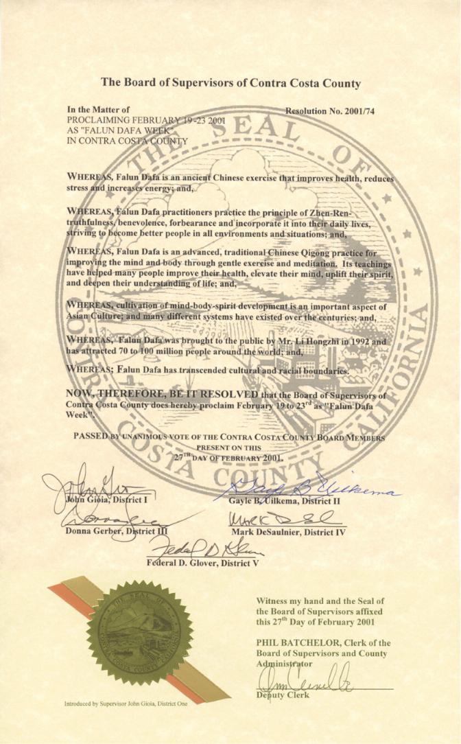 【明慧网2001年3月14日】 加州康特拉考斯塔郡(Contra Costa County, California)宣布2001年2月19日至23日为法轮大法周