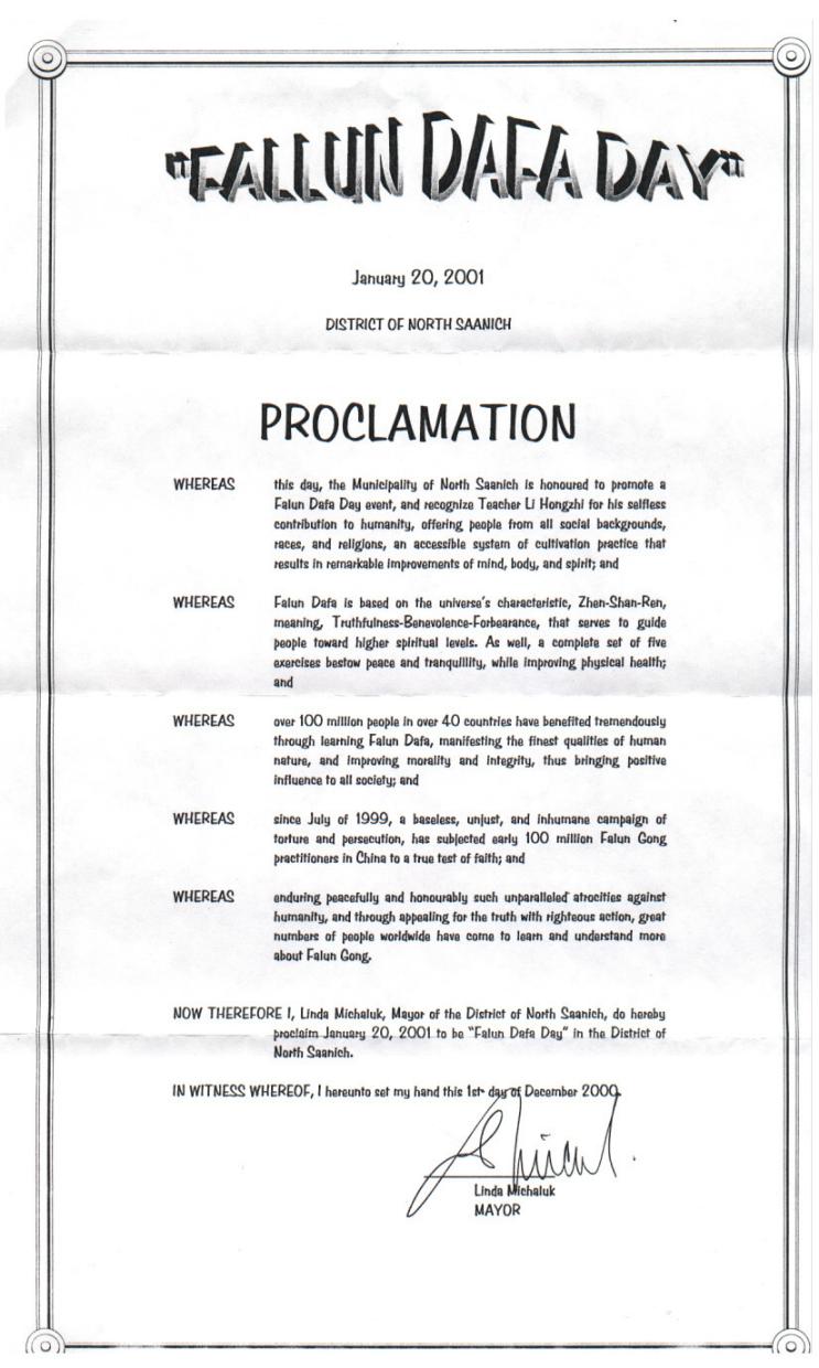 【明慧网2001年3月18日】 加拿大不列颠哥伦比亚省北萨尼克区宣布2001年1月20日为“法轮大法日”