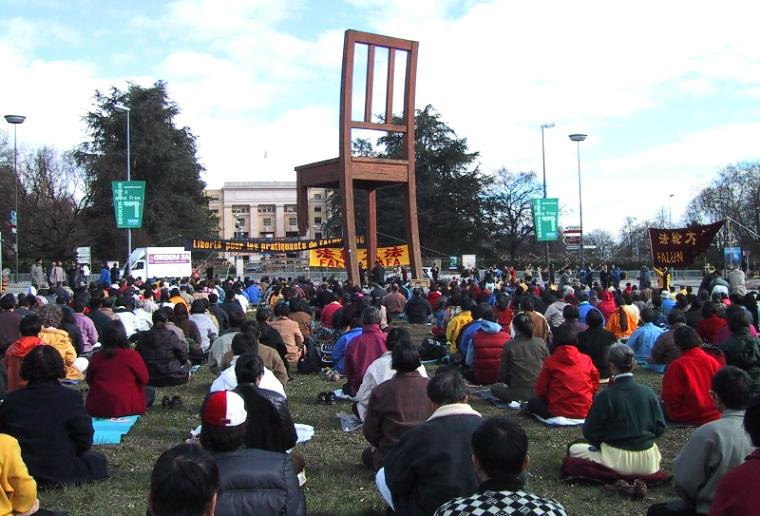 3月19日周一上午,来自欧洲及世界各地的一千多名法轮功学员在日内瓦联合国总部前的两个大草坪上炼功请愿,呼吁联合国及国际社会继续关注中国政府对大陆法轮功学员基本人权的严重侵犯,并帮助制止江泽民一夥的已持续近两年的对法轮功学员的犯罪行为。