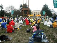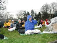近千名来自世界各国的法轮功学员冒着细雨,坐在泥泞的草地上,不受干扰地静静打坐。从下午两点开始,学员们轮流地一遍一遍做着静功和动功,整个场祥和纯正,吸引着路过的行人和车辆不断回头注目。金色的“法轮大法”中英文横幅和蓝底黄色的英法文横幅“停止镇压法轮功”给整个场面加上了明亮肃穆的色彩。路边一字排开着以中文和法文介绍大法在世界洪传及在中国受镇压情况的图片,不时有行人驻足观看。