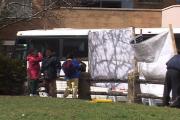 中国大使馆前的大型展板 大使馆用大巴挡住展板 法轮功学员在中国大使馆门前炼功