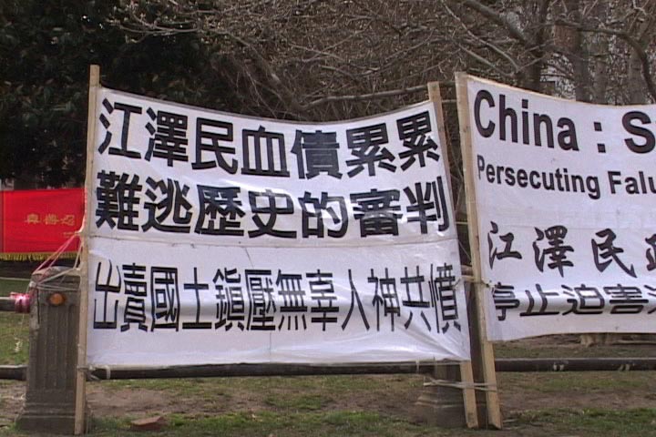 在大陆,何等嚣器,发动所有的媒体向法轮功开战,到了美国,连几个人举个展板的镜头都不敢面对。中国官员的掩耳盗铃,只敢关起门来找几个“友好”人士开声讨会的本身,就暴露了江泽民镇压法轮功缺乏合法性,与不得人心。