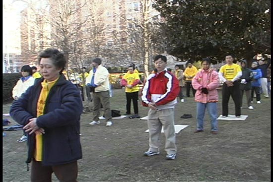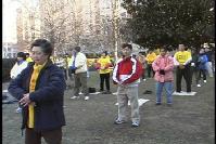 本周一的早晨,法轮功的纪律完美无缺。主要由当地的中国人组成的维护秩序人员让人们遵守人行道的红绿灯。在广场的中央及CAMPAGNE RIGOT的四周,1000人排成一个个单行。他们炼他们的功法,伴有口令的中国音乐控制着节奏。手臂起伏飘动,身躯弯而不折,一幅微风下芦苇的画面。一些人根据所属国家分成小组。强大阵容的台湾团体举着他们的牌子。大家用英语或手势交流着。一个穿着中国服装的瑞典人把他的炼功垫子借给了一位来自巴黎的中国老人,气氛一片祥和。