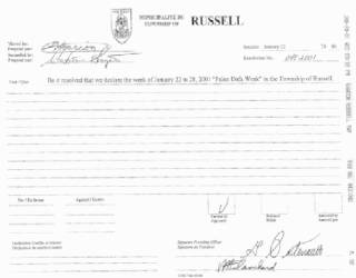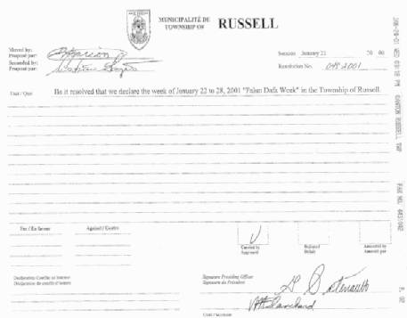 【明慧网2001年3月6日】 加拿大安大略省拉塞尔镇宣布2001年1月22-28日为“法轮大法周”
