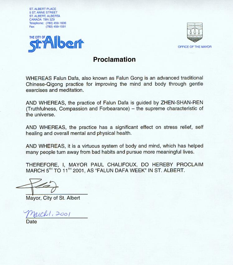 【明慧网2001年3月6日】 加拿大阿尔伯塔省圣奥伯特市宣布2001年3月5-11日为“法轮大法周”