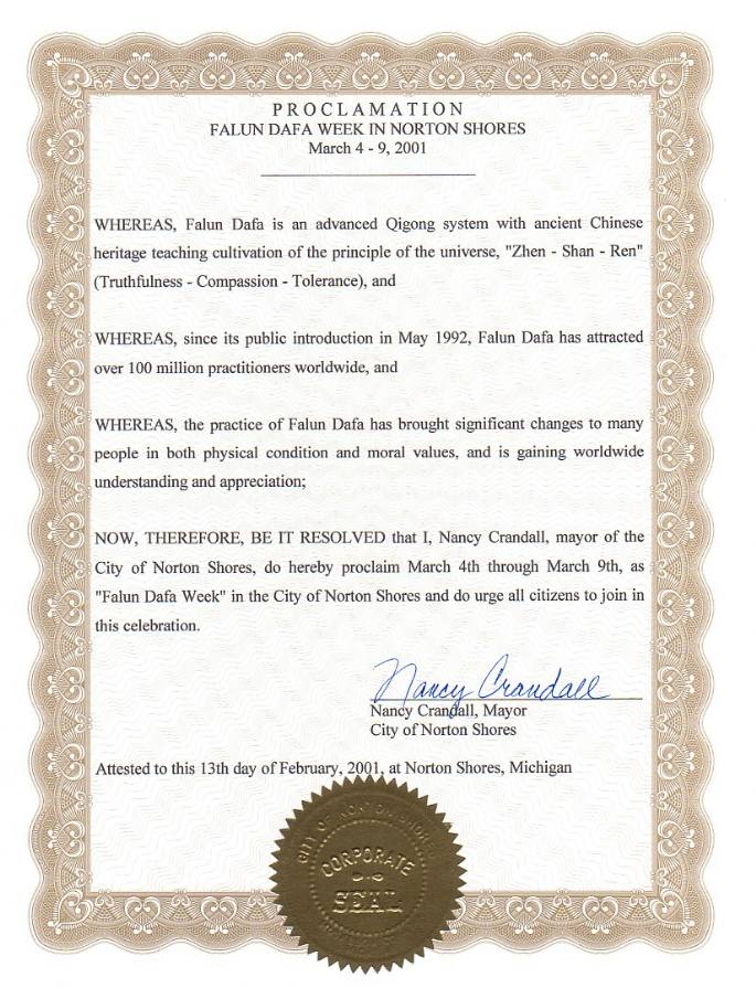 【明慧网2001年3月7日】 密歇根州诺顿湖滨市宣布2001年3月4日-9日为“法轮大法周”