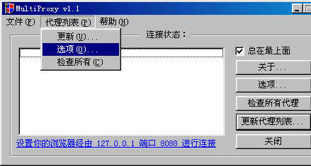 1) Multiproxy的特点就是能够使用户同时使用多个代理服务器,达到万马齐驱的目的。理想状态是越多的代理服务器同时工作,速度就越快。但是实际并不是如此。Multiproxy默认最多同时连接的代理服务器是8个,这个数字一般比较科学。虽然用户可以改变最大同时连接数,但我建议还是不改的好。这样我们就可以发现我们只需要少量的代理服务器地址就行了,而不是输入成千上百的地址就能达到更高的速度。相反越多的代理服务器地址在启动Multiproxy时,验证时间也就越长,通常是不可取的。一般列表中有10-15个匿名的国外代理服务器比较好。